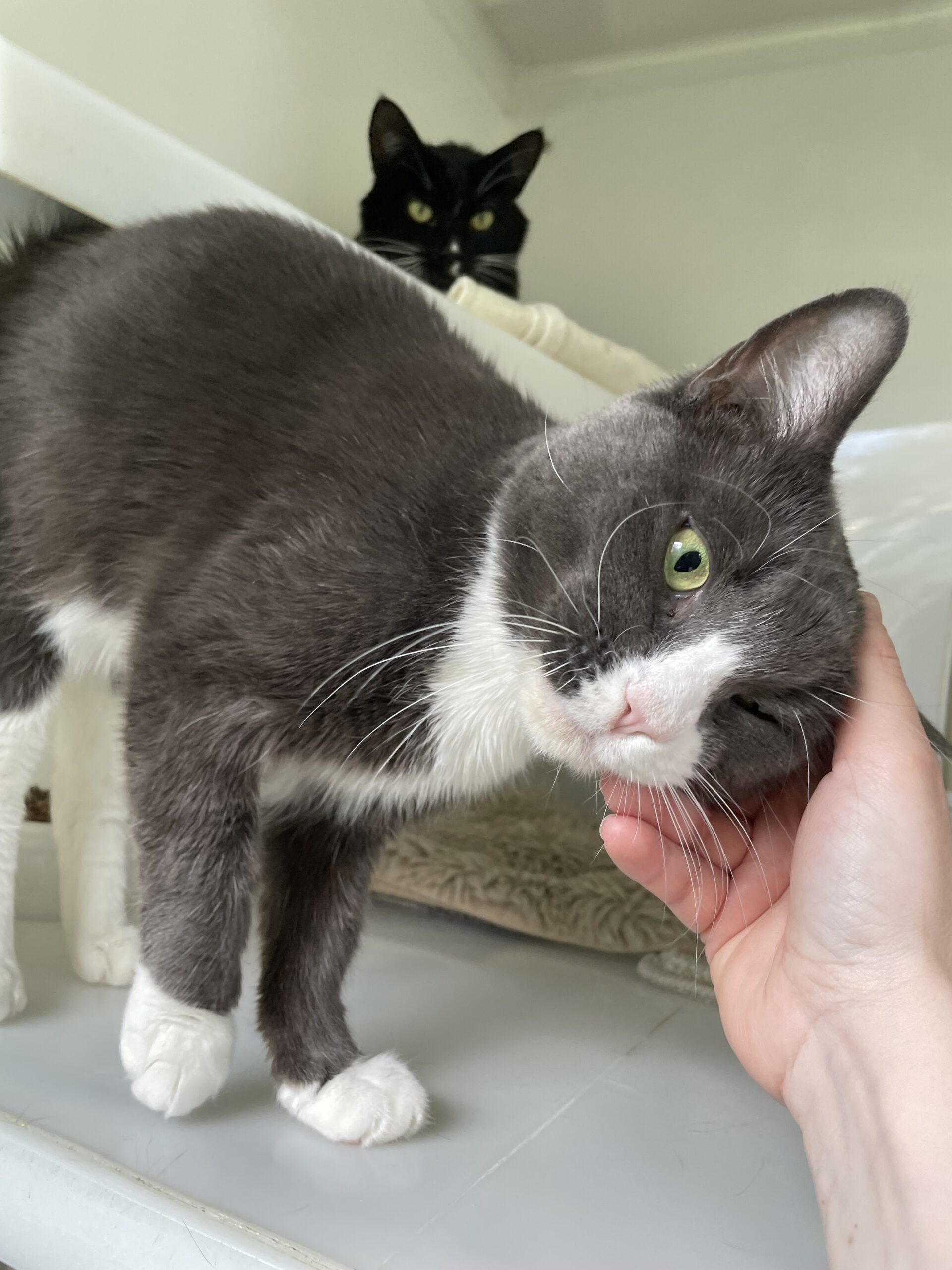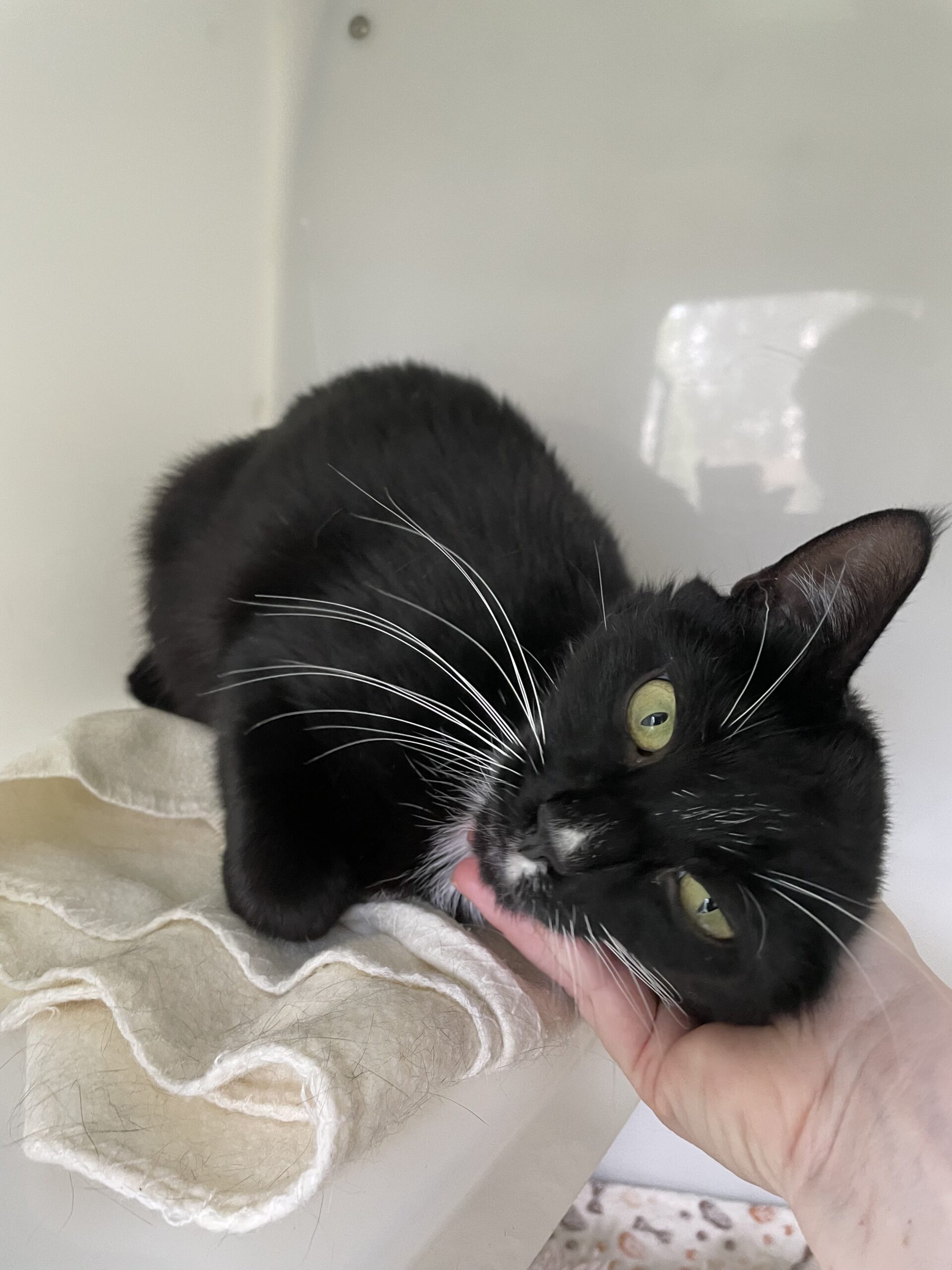 Sweet boys Tom (grey) and Bunny (black) are a shy, bonded pair. They were brought to us due to a family member developing allergies. They are ok with cats but do not like dogs. They’ve haven’t been around children before and would be best suited to a calm household. This adorable pair love a good fuss once they know you and they are very enthusiastic with their head butts. They enjoy a bit of catnip spray on a soft toy and love dreamies. These brothers have been with us since early February and it’s definitely time they found their forever home together.