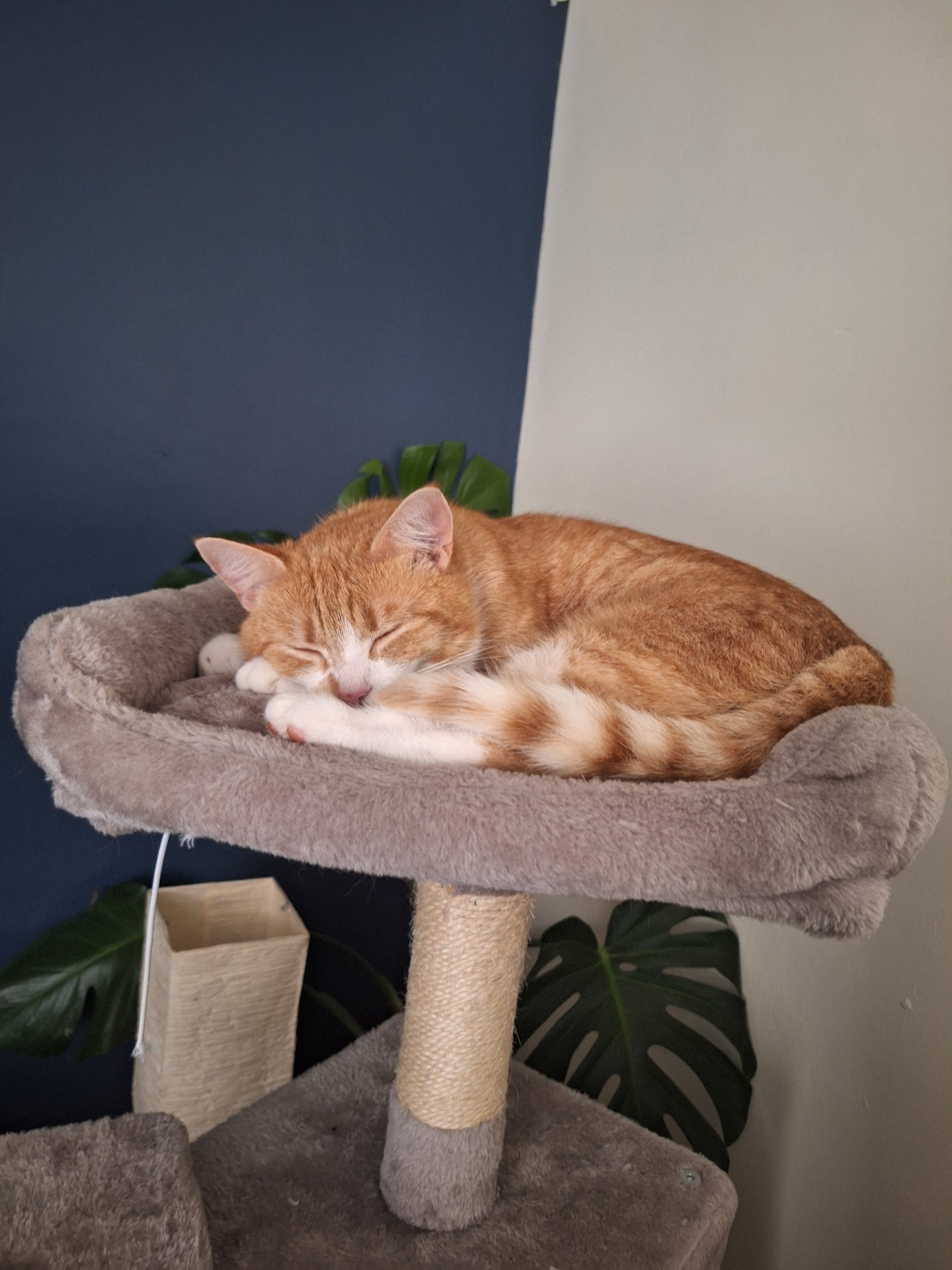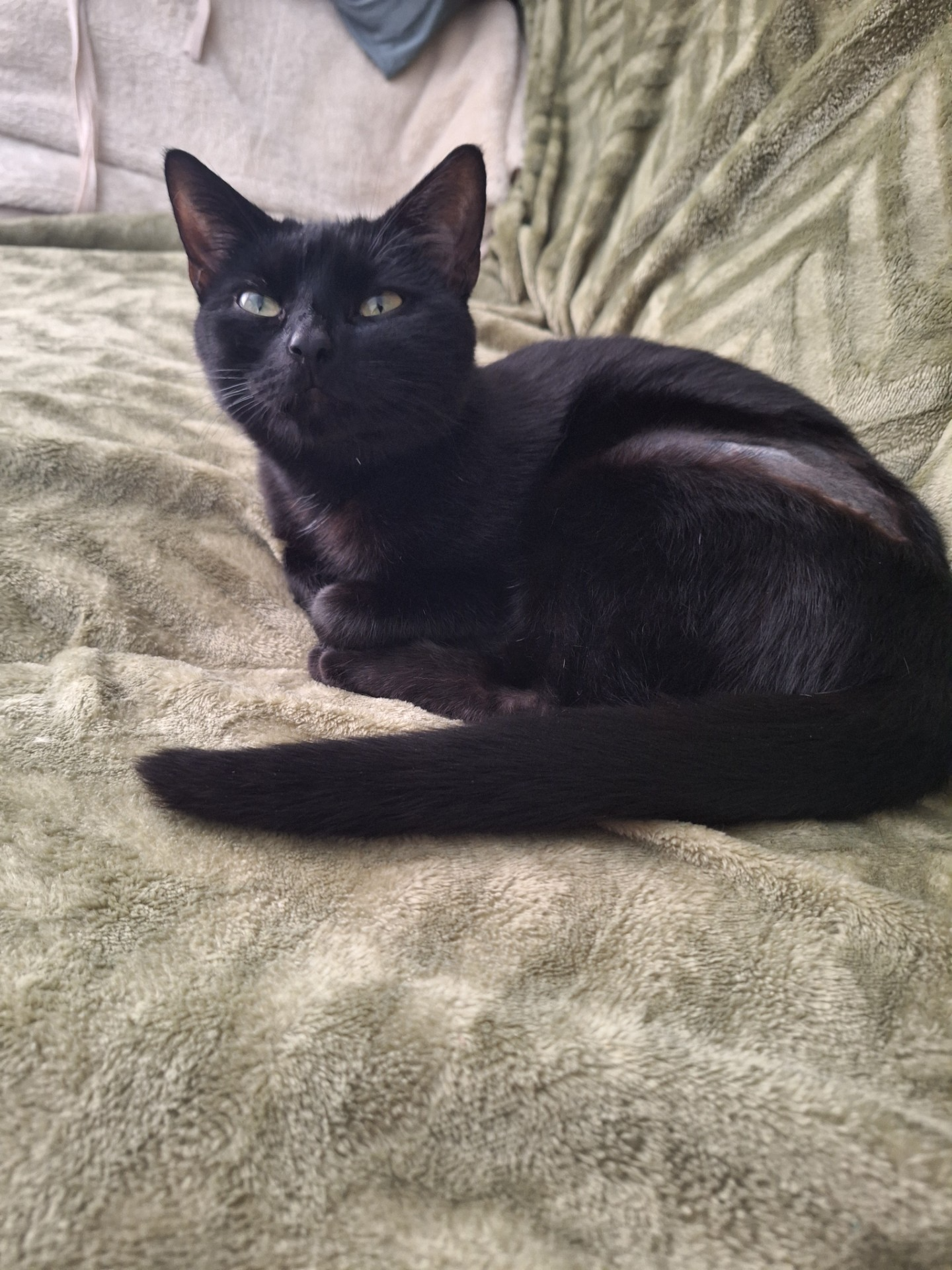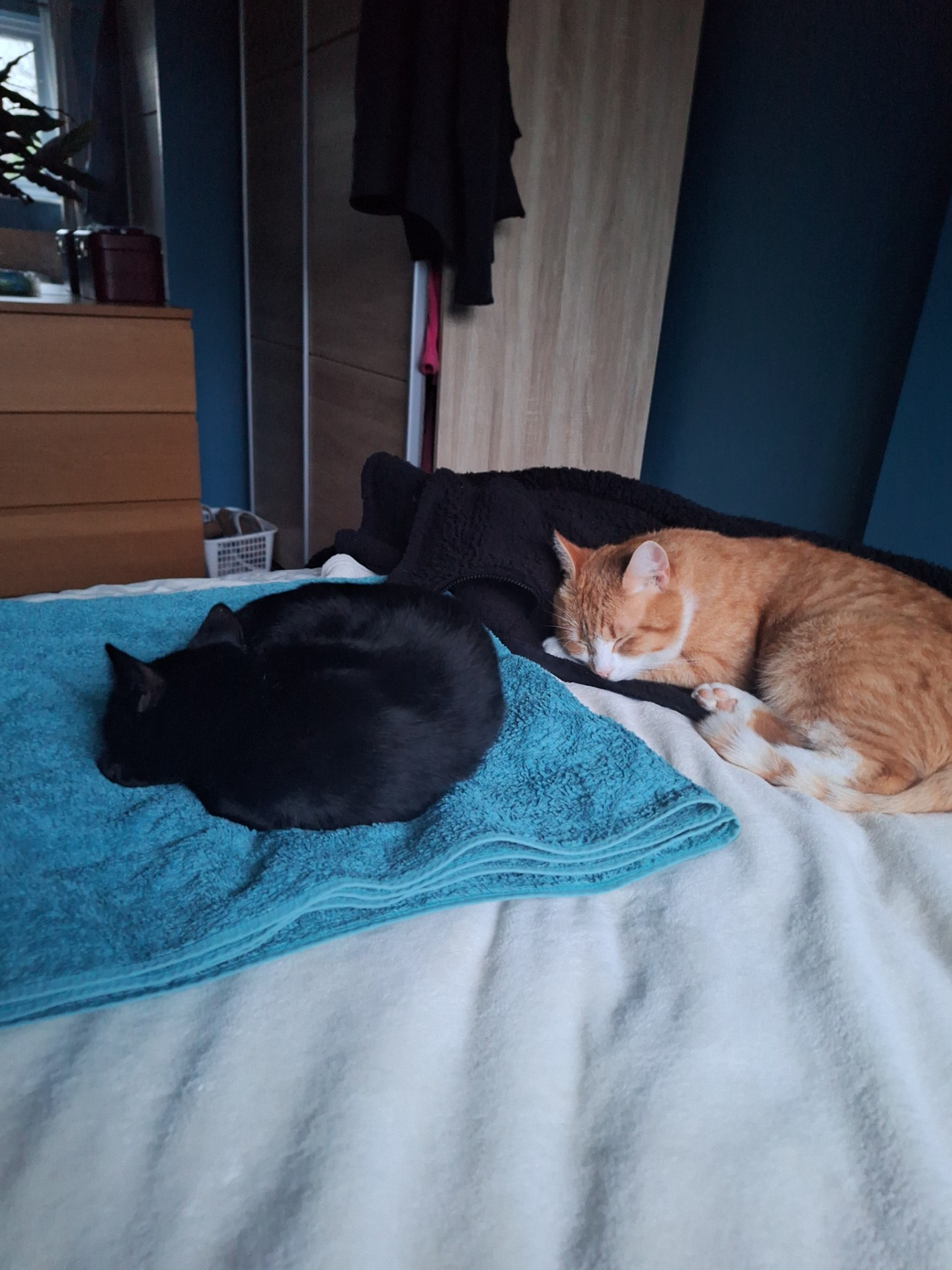 Just wanted to let you know that this dynamic duo have settled in really, really well…we were amazed to see that they hit it off almost immediately and now if you can find one then the other won’t be far away. They sleep together, eat together and play together – taking it in turns to play with their toys . Ronnie is a lovable, energetic, playful little goofball who loves his roast chicken treats (as well as prawns, tuna, duck…) and Lola is definitely his boss. She is the brains who will give him a quick clip round the ears when she’s had enough of his antics and is a total lovebug who wants warm laps, bed snuggles and her favourite cat yoghurt treats.